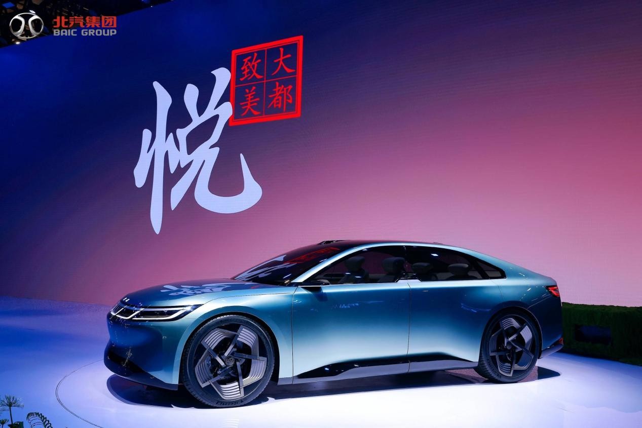 最国潮的车型,当属品牌焕新后的北京带来的概念车“悦”。极具辨识度的“五孔元素”前脸表明了它“北京”的身份,座椅靠背上镂空的中国结装皮纹装饰以及轮毂藏“福”的细节,突然让人有种“买几辆,当婚车”的冲动。