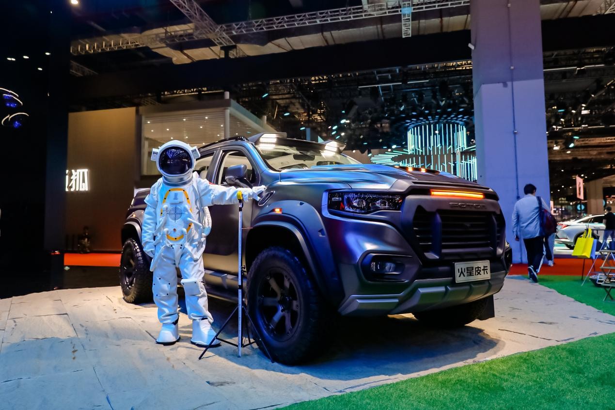 要想看更“荒野”的,还要往后台走走,在福田火星皮卡展区,坐进皮卡座舱,抬升地盘,目视眼前的一颗颗“星球”,满满的“流浪地球3”即视感。