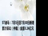 【ST迪马:7月5日至7月30日新增累计诉讼(仲裁)金额3 24亿元】,ST迪马公告,7月5日至7月30日新增累计诉讼(仲裁)金额3 24亿元,占公司20 浏览全文>>