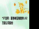 【*ST吉药:董事单宝海增持1 02万股公司股份】,*ST吉药公告,公司董事单宝海于2024 7 26通过集中竞价方式增持1 02万股,占公司总股本的0 0 浏览全文>>