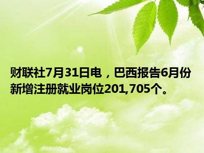 财联社7月31日电,巴西报告6月份新增注册就业岗位201,705个。