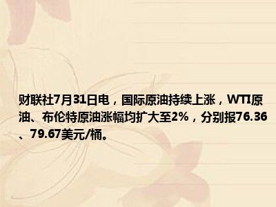 财联社7月31日电,国际原油持续上涨,WTI原油、布伦特原油涨幅均扩大至2%,分别报76.36、79.67美元/桶。