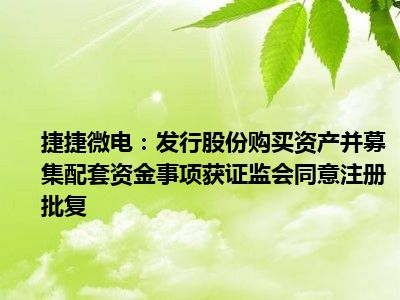【捷捷微电:发行股份购买资产并募集配套资金事项获证监会同意注册批复】,捷捷微电公告,公司拟通过发行股份及支付现金方式购买捷捷微电(南通)科技有限公司30.24%股权,并同时向不超过35名特定对象发行股份募集配套资金。公司近日收到证监会批复,同意公司发行股份购买资产并募集配套资金的注册申请。
