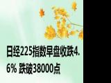 【日经225指数早盘收跌4 6% 跌破38000点】,日经225指数早盘收盘下跌4 6%,报37980 34点。日本东证指数收跌3 3%。浏览全文>>